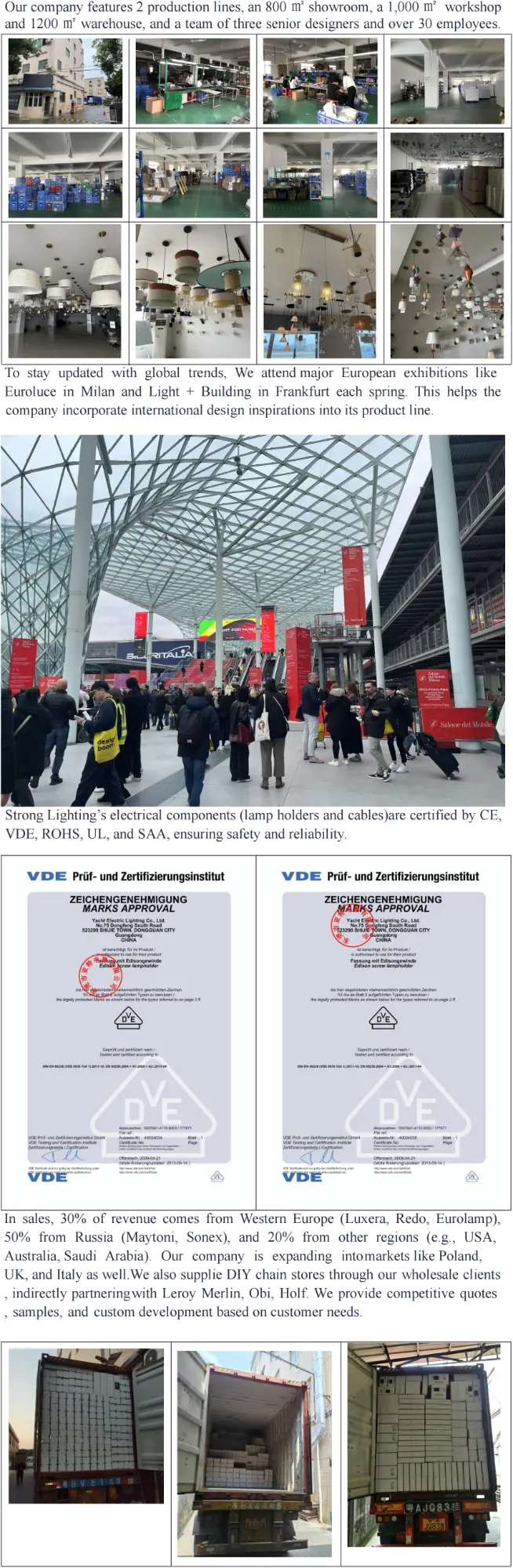 Olemme ylpeänä palvelleet maailmanlaajuisia nimiä, kuten Leroy Merlin ja OBI, rakentaen mainetta erinomaisesta suunnittelusta, kestävästä laadusta ja oikea-aikaisista toimituksista. Vuodesta 2015 lähtien Strong Lighting on omistautunut luomaan henkilökohtaista tyyliä heijastavia valaistusratkaisuja. Yli 3 000 tuotevalikoimamme kattaa klassisista nykyaikaisiin materiaaleja, kuten lasia, metallia ja kristallia, luomaan innovatiivisia, toimivia kappaleita.