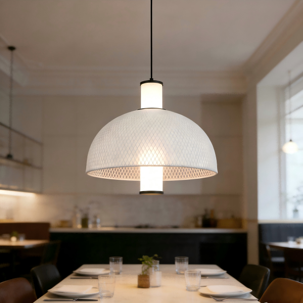 Tämä Strong Lightingin minimalistinen italialainen silkkiverkkoriippuvalaisin, joka on saanut inspiraationsa Milanon 2025 Euroluce-näyttelyn huippuluokan suunnittelutrendeistä, yhdistää saumattomasti italialaista minimalismia ja käytännöllistä toimivuutta. Keskimmäinen 15 W LED-valolähde lähettää 4000K neutraalia valoa luoden mukavan tunnelman. 1500 LM:n kirkkauden ja korkean värintoistoindeksin Ra>80 ansiosta valo on luonnollista ja aitoa, joten se sopii olohuoneisiin, ruokailutiloihin ja muihin tiloihin. Pyöreä kaaren muotoinen lampunvarjostin on valmistettu rautaverkosta, joka on kiedottu valkoisen silkkikankaan ympärille, ja mattamusta laitteisto on viimeistelty ruiskumaalauksella teksturoinnin lisäämiseksi. Yksinkertainen muotoilu integroituu helposti pohjoismaiseen, moderniin ja muihin kodin tyyleihin.